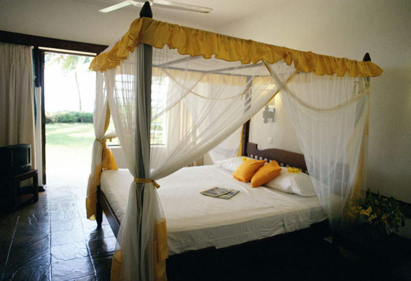 120 comfortable air-conditioned rooms built in Swahili style nestled in exotic gardens where colobus monkeys populate ancient baobab trees. Garden Rooms are air-conditioned with a view of the garden/pool, ceiling fan, double or twin beds, mosquito net, safe, telephone, shower & w.c. and balcony or patio. Family Cottage Rooms have garden view and an area with two extra beds. Beachfront Rooms are as Garden Rooms plus four poster bed, bath, TV, fridge and sea view.